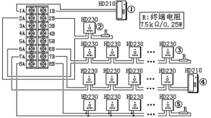 - HD230電話插孔可并聯(lián)使用,每門-多可接入30個,末端需接入終端電阻7.5K(隨主機配給),用于開路故障判斷。